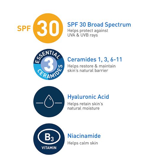 CeraVe AM Facial Moisturizer is a morning skincare multitasker that moisturizes and nourishes your skin while helping to absorb and reflect the sun’s damaging UVA and UVB rays. It’s formulated with three essential ceramides, along with hydrating hyaluronic acid, soothing niacinamide, InVisibleZinc™ Technology (microfine zinc oxide), and our MVE technology—which releases a steady stream of moisturizing ingredients for continuous, all-day hydration.