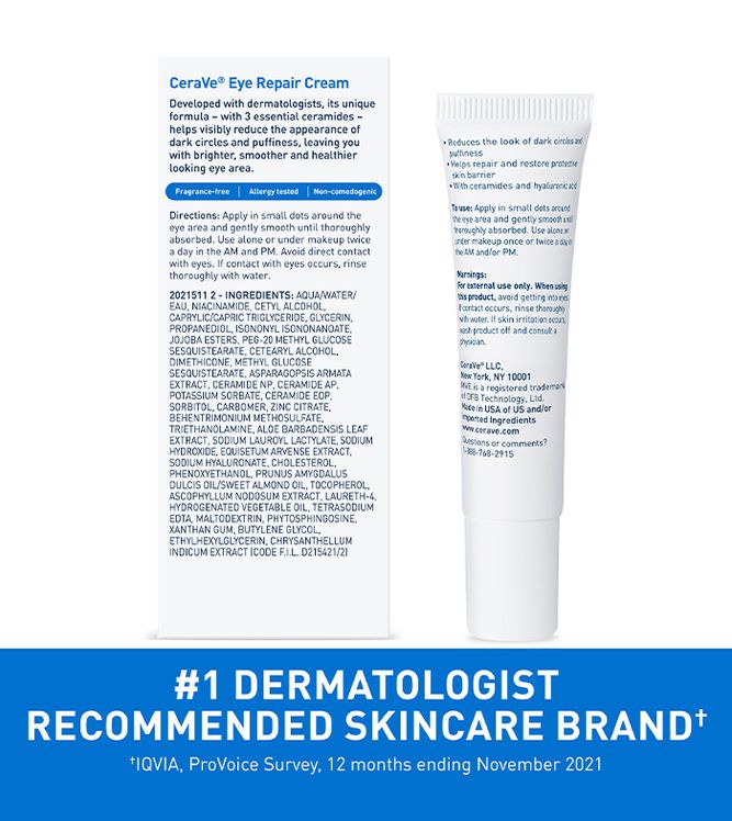 CeraVe Eye Repair Cream is ophthalmologist-tested and features a non-greasy, fast-absorbing, fragrance-free formula that works to minimize the appearance of dark circles and eye puffiness. It’s formulated with three essential ceramides, hyaluronic acid, niacinamide, and a Marine & Botanical Complex to help brighten your entire eye area. Plus, MVE technology continually releases moisturizing ingredients for all-day hydration. Allergy-tested