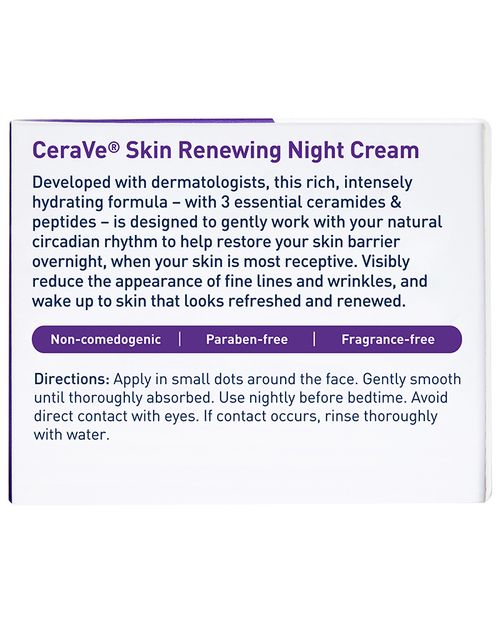 Suitable for all skin types, CeraVe Skin Renewing Night Cream features a complex of biomimetic peptides, hyaluronic acid, and 3 essential ceramides that work together to lock in skins moisture and help restore your skin’s protective barrier overnight. Our non-greasy, intensely moisturizing skin renewing night cream is designed to soften and renew the look of tired skin, and our patented MVE technology encapsulates ceramides to ensure efficient delivery within the skin’s barrier and slow release over time. Supporting your protective skin barrier, long after you’ve finish applying —so you can wake up looking rested and rejuvenated.